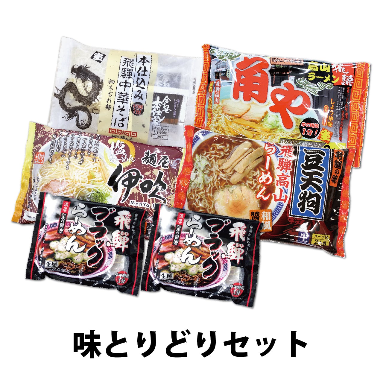 コク深い醤油味の本仕込中華や和風醤油の効いた豆天狗ラーメン、飛騨高山「麺屋伊吹」監修の塩ラーメン。たまり醤油を使用したコクのある黒いスープが特徴のブラックラーメンなど、味とりどりの商品を集めたセットです。