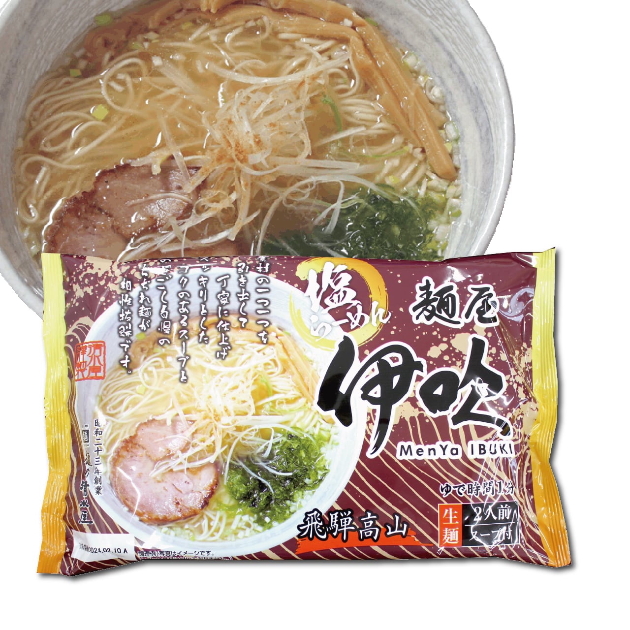 飛騨高山の人気店「麺屋伊吹」監修。人気メニューの塩らーめんは、鶏・豚・魚介のバランスのとれた旨みを活かしたコク深い旨味たっぷりのスープです。